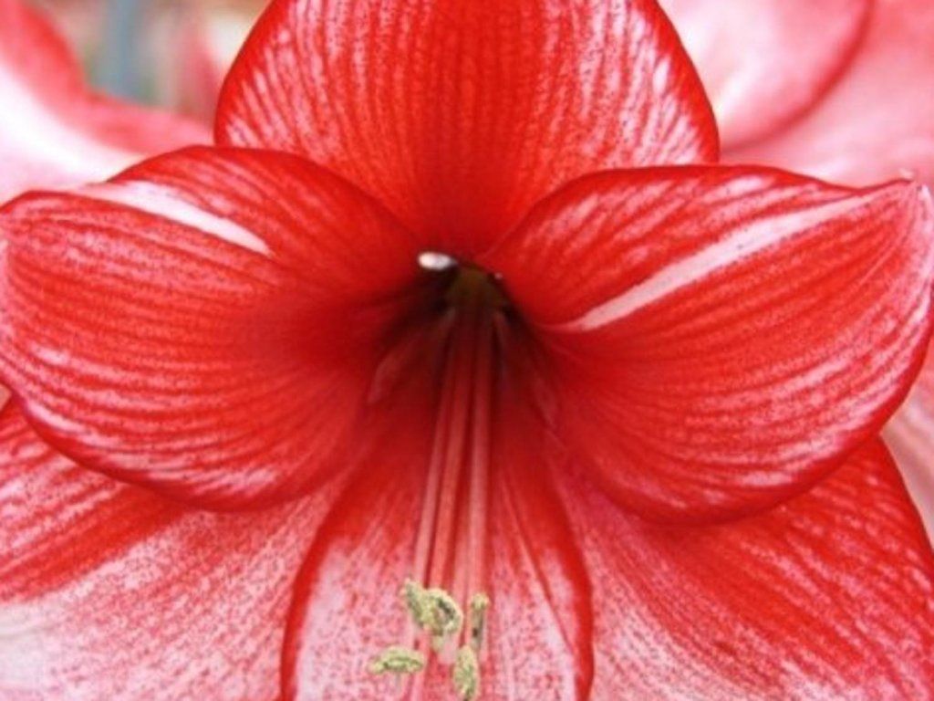 Amarylis 'Charisma' - spośród dużych białych kwiatów tej odmiany rozlewa się intensywny, jasnoczerwony kolor; czerwony kolor jest również widoczny w żyłkowaniu. Osiąga wysokość 50-60 cm.