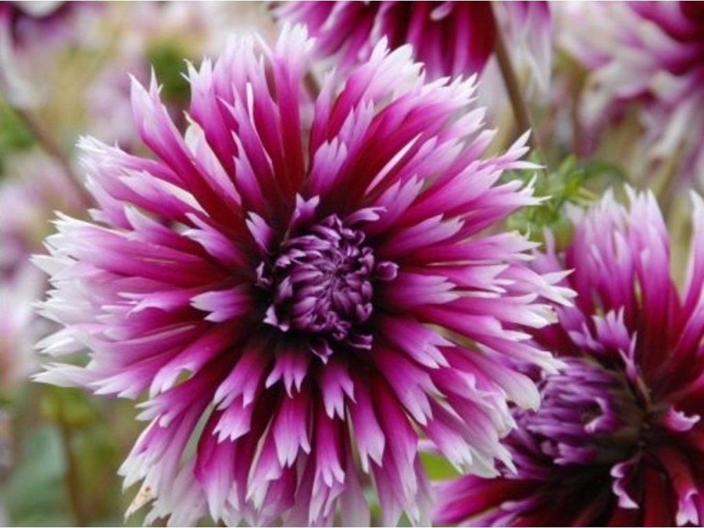 Goryczka 'Alauna Clair-Obscur' - dalie należą do najpopularniejszych roślin cebulowych ozdobnych w ogóle. Ta odmiana tworzy duże, efektowne kwiaty, które są wybarwione na jasne i ciemne odcienie fioletu z białymi końcówkami i doskonale kontrastują z jasnozielonymi liśćmi. Kwiaty składają się z gęsto i regularnie rozmieszczonych płatków języczkowatych. Wyrastają na końcach wyprostowanych łodyg i pojawiają się od lipca do października. Osiąga wysokość do 120 cm. Jej sadzenie jest idealne w każdej kompozycji ogrodowej, ale najlepiej prezentuje się w nasadzeniach grupowych z innymi gatunkami dalii i nadaje się do cięcia do wazonu.