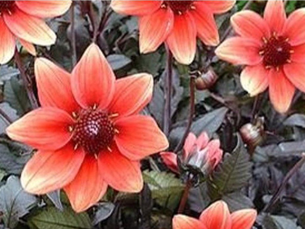 Dalii 'Dragon Ball' - odmiana o pięknych pomarańczowo-czerwonych kwiatach z jaśniejszym wierzchołkiem, środki kwiatów mają ciemnobrązowy kolor. Liście są ciemno zabarwione, aż czarne, tę samą barwę mają również łodygi. Jest to wyjątkowy dodatek do każdego ogrodu. Osiąga wysokość około 40 cm. Kwitnie od czerwca do października.