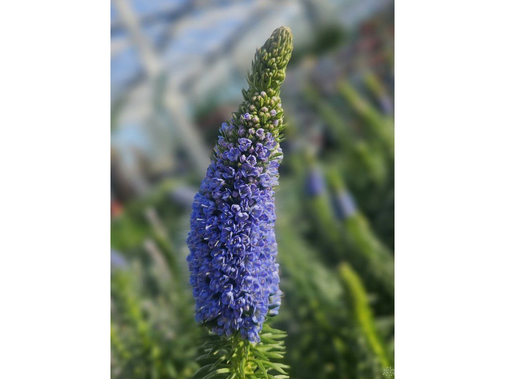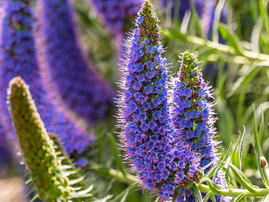 Żmijowiec kanaryjski – znany również jako żmijowiec drzewiasty, pochodzi z Wysp Kanaryjskich, gdzie zasiedla suche, słoneczne stoki z kamienistą i dobrze przepuszczalną glebą. Ta charakterystyczna odmiana tworzy wiecznie zielony, bogato rozgałęziony krzew osiągający wysokość 1–2 m i szerokość 1–1,5 m. Liście ma podłużne, szarozielone, delikatnie owłosione i skupione w gęste rozety na końcach pędów, co nadaje roślinie zwarty i zadbany wygląd również poza okresem kwitnienia. Od maja do lipca nad liśćmi wznoszą się efektowne, gęste kwiatostany o stożkowatym kształcie i długości 20–30 cm. Pojedyncze kwiaty są drobne, niebieskofioletowe, z wyraźnie wystającymi pręcikami, które nadają kwiatostanom delikatnie „puszysty” efekt. Roślina jest bardzo atrakcyjna dla zapylaczy, zwłaszcza pszczół, trzmieli i motyli. W kompozycji ogrodowej sprawdza się jako dominująca soliter lub wyrazisty element pionowy, dobrze komponuje się z gatunkami śródziemnomorskimi, takimi jak lawenda, santolina, szałwia czy rozmaryn, lub z trawami ozdobnymi na bardziej suchych stanowiskach.
