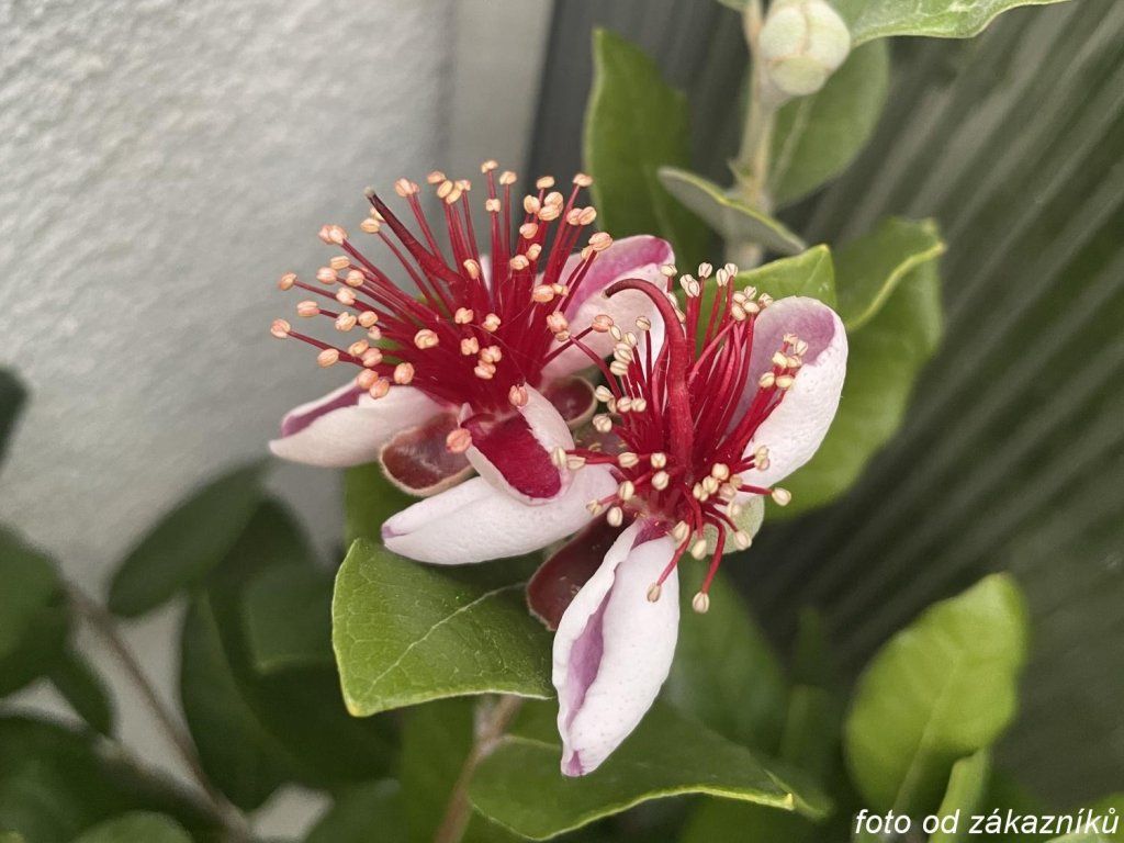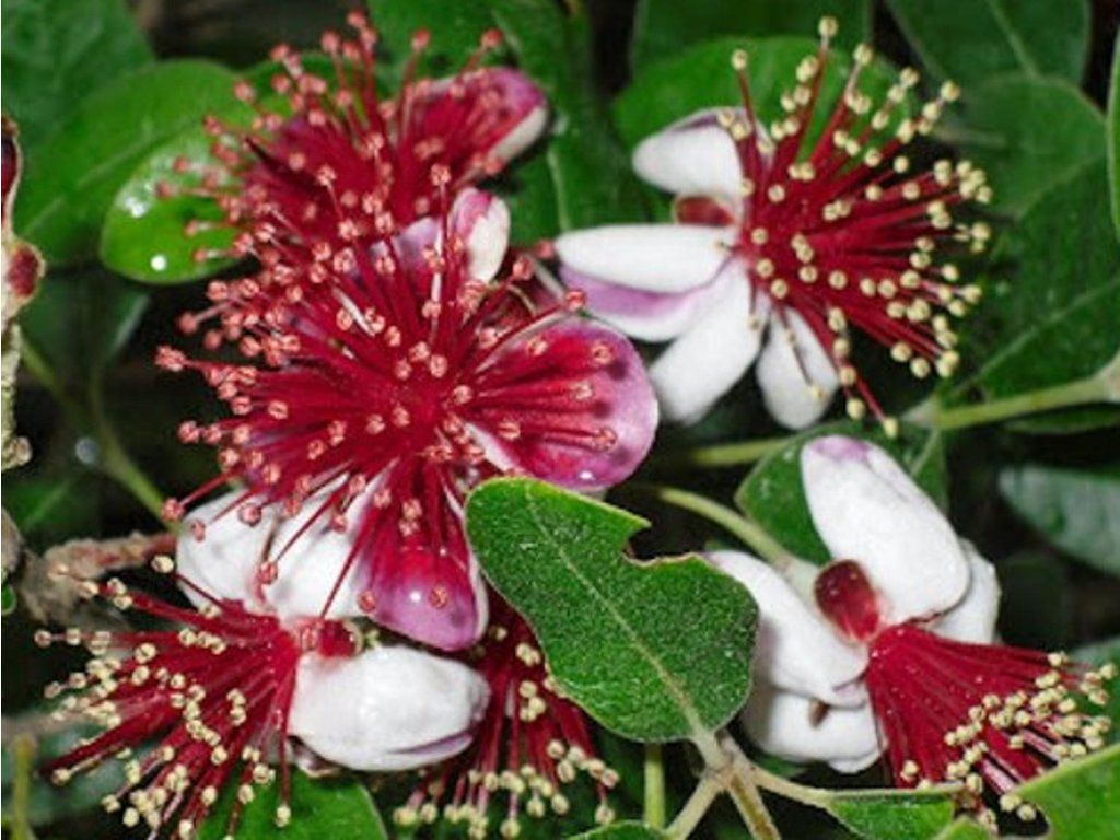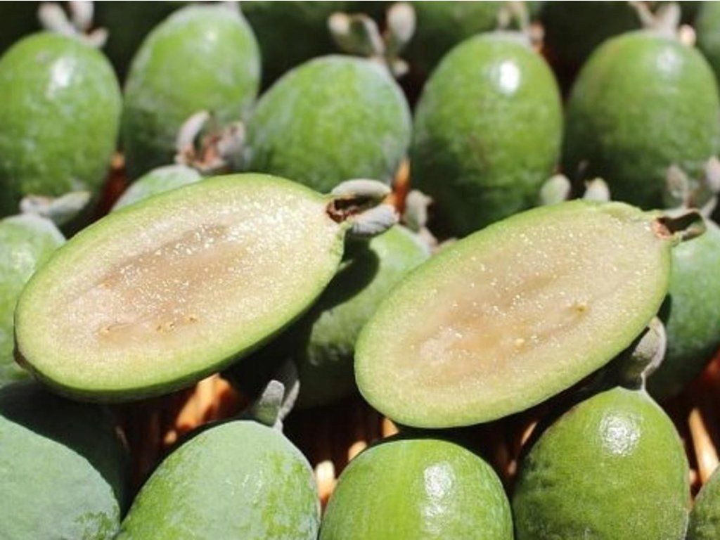 Fejchoa - pochodzi z górzystych regionów południowej Brazylii, Urugwaju i północnej Argentyny. W swoim ojczystym kraju rośnie na słonecznych zboczach i otwartych zaroślach. Ten gatunek z rodziny mirtowatych tworzy gęsty, wiecznie zielony krzew o wysokości zazwyczaj 2-3 m, w ciepłych warunkach nawet więcej. Liście ma skórzaste, eliptyczne, z wierzchu ciemnozielone, od spodu kutnerowate i srebrzystoszare, co nadaje roślinie dekoracyjny wygląd przez cały rok. W czerwcu i lipcu kwitną pojedyncze kwiaty o średnicy 3-4 cm z mięsistymi, białymi lub różowawymi płatkami i efektownym pęczkiem karmazynowych pręcików. Płatki są jadalne i mają słodki smak. Owoce dojrzewają od października do listopada, są jajowate, długości 4-8 cm, z zieloną skórką i kremowym miąższem. Smak jest aromatyczny, przypomina połączenie ananasa, truskawki i mięty. Zawierają witaminę C, błonnik i polifenole. Dla wyższych plonów zaleca się uprawę dwóch genetycznie odmiennych roślin, ponieważ zapylenie krzyżowe zwiększa zawiązywanie owoców.