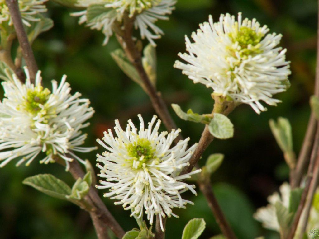 Fotergila większa - to zrzucający liście krzew ozdobny z rodziny oczarowatych, pochodzący z południowo-wschodniej części Ameryki Północnej, gdzie rośnie na obrzeżach lasów i na wilgotniejszych, kwaśnych stanowiskach. Gatunek został wprowadzony do europejskich ogrodów w XIX wieku i ceniony przede wszystkim za połączenie wiosennego kwitnienia i wyrazistego jesiennego ubarwienia. Krzew osiąga około 1,5-2 m wysokości i 1,2-1,8 m szerokości, rośnie powoli i tworzy gęsty, szeroko rozłożysty pokrój z lekko nieregularną sylwetką. Liście są jajowate do odwrotnie jajowatych, średnio zielone, o delikatnie pofalowanym brzegu, jesienią przebarwiają się w bogatą mieszankę żółci, pomarańczy, czerwieni i purpury, często jednocześnie na jednym krzewie. Kwiaty pojawiają się w kwietniu do maja przed pełnym ulistnieniem, są białe, bez płatków korony, zebrane w gęste, cylindryczne kwiatostany o długości 4-6 cm. Pręciki nadają kwiatom wygląd szczoteczki i delikatny, słodko-miodowy zapach, który jest również atrakcyjny dla pszczół. Fothergilla major sprawdza się jako soliter, w grupach krzewów lub w połączeniu z rododendronami, azaliami i oczarami, z którymi dzieli podobne wymagania glebowe.