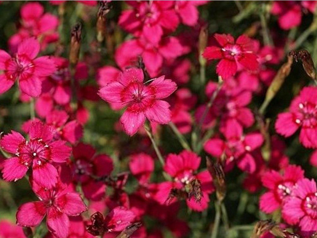 Goździk kropkowany 'Nelli' - Bardzo dekoracyjna, wieloletnia roślina. Osiąga wysokość około 20 cm. Kępiasta, wieloletnia roślina tworząca przyziemną rozetę liści, na prostych łodygach kwitną czerwone, drobne, ząbkowane na brzegach kwiaty z ciemniejszym okręgiem. Kwitnie od czerwca do sierpnia, w luźnych kwiatostanach lub pojedynczo. Liście są szaro-zielone, oszronione, o długości do 1,5 cm. Nie znosi nadmiernego nawodnienia. Idealne miejsce to pełne słońce, do ogrodów skalnych, wrzosowisk lub rabat.