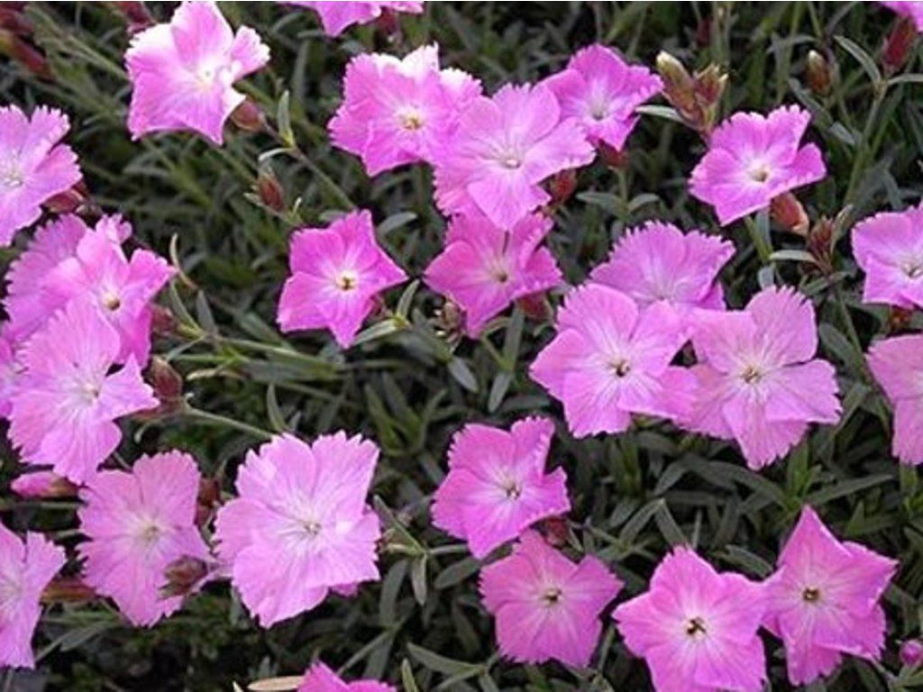 Goździk szary 'Nicola' - Łatwa w uprawie, silnie pachnąca i zimozielona bylina, osiągająca wysokość 20 cm. Bylina tworząca kępy. Na prostych łodygach kwitną pełne, ząbkowane na brzegach, w środkowej części od wewnętrznej strony owłosione, długoogonkowe, o średnicy 1,5 do 3 cm, różowe kwiaty. Kwitnie pojedynczo od maja do czerwca. Liście są szaro-zielone, wąskie. Nie znosi nadmiernego nawodnienia. Idealne miejsce to skalniaki lub obrzeża rabat.