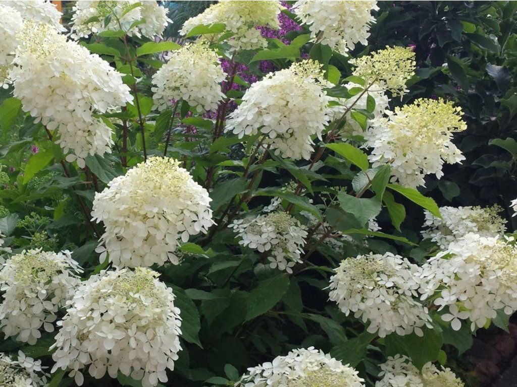 Hortensja bukietowa 'Phantom' - odmiana wyróżniająca się dużymi wiechami kwiatów i silnym, wyprostowanym wzrostem. W dorosłości osiąga 2 do 2,5 m wysokości i 1,8 do 2 m szerokości, tworząc gęsty krzew z silnymi, dobrze zdrewniałymi pędami. Liście są jajowate, intensywnie zielone, a jesienią mogą przebarwiać się na żółtawe odcienie, uzupełniając późnoletni efekt krzewu. Stożkowate wiechy pojawiają się od lipca i często utrzymują się do września, początkowo są kremowo-białe, później nabierają lekko różowego odcienia. Kwiaty tworzą się na pędach jednorocznych, dlatego krzew kwitnie regularnie nawet po silniejszym cięciu wiosennym. Odmiana 'Phantom' sprawdzi się jako soliter na trawniku, przy pergolach lub w luźniejszych żywopłotach, gdzie stanowi wyrazistą letnią dominantę. W połączeniu z trawami ozdobnymi, różami i ciemnozielonymi iglakami tworzy kompozycje o wyraźnym kontraście kształtów i tekstur. Wiechy kwiatowe można pozostawić na krzewie przez całą zimę, kiedy tworzą lekką strukturę nad śniegiem, lub wykorzystać do cięcia i suszenia.