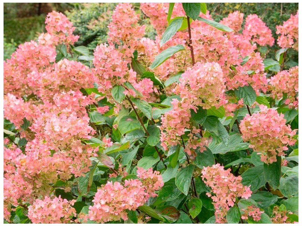 Hortensja bukietowa 'Tickled Pink' - nowo wyhodowana odmiana popularnej hortensji, która tworzy wyprostowany, zwarty krzew osiągający wysokość 150 cm i szerokość 200 cm. Już na początku lipca na końcach wyprostowanych pędów pojawiają się w dużej liczbie drobne kwiaty, ułożone w wiechy. Początkowo mają biały kolor, a w trakcie kwitnienia przebarwiają się na odcienie różu. Ciemnozielone liście wspaniale kontrastują z kwiatami. Jesienią żółkną i opadają. Idealna jako soliter do każdego ogrodu.