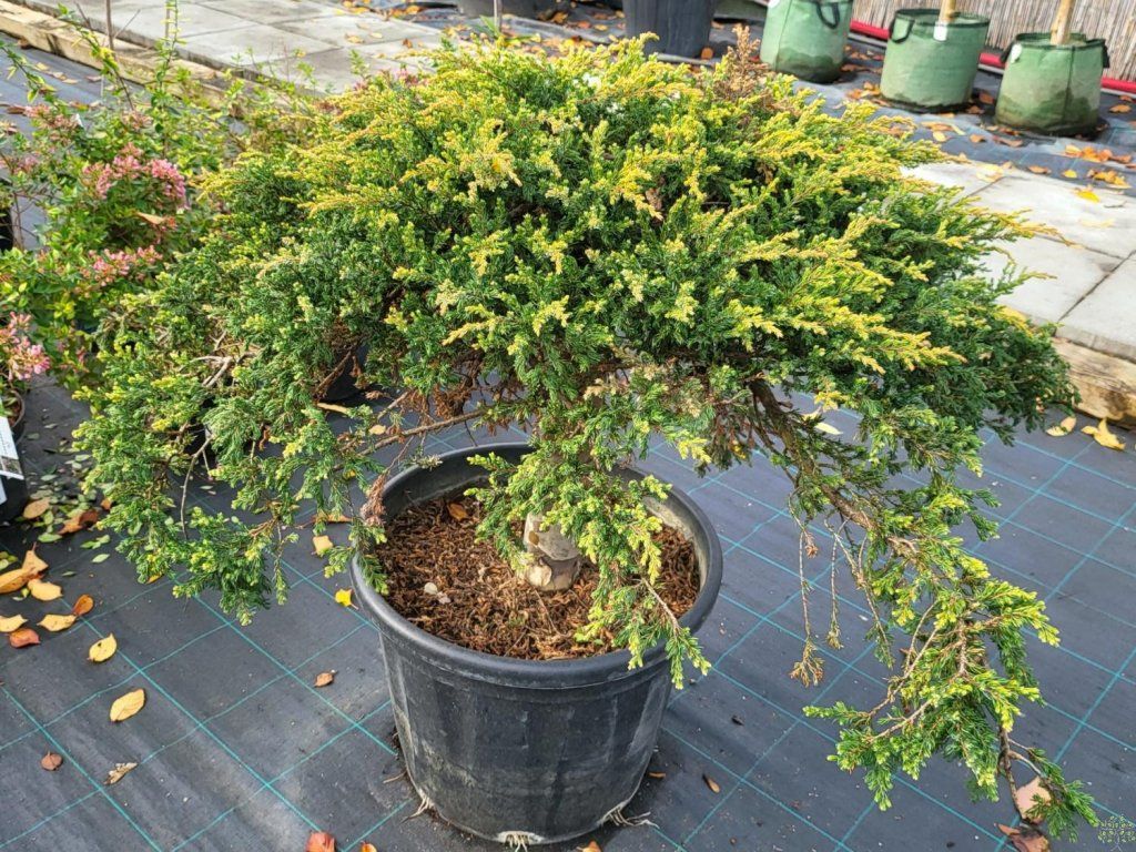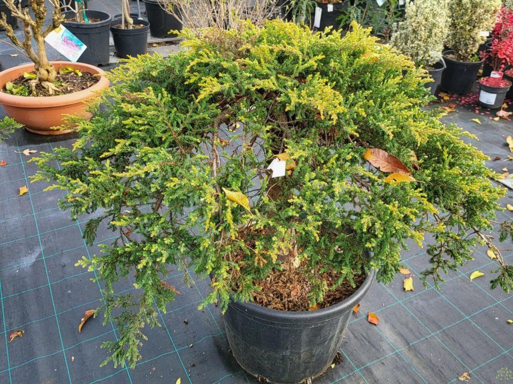 Jałowiec 'Golden Shade' - atrakcyjne, wiecznie zielone drzewo iglaste o płożącym lub rozłożystym pokroju, które wyróżnia się złotawym odcieniem zieleni. Ten kultywar jest ceniony za swoje walory dekoracyjne, niewielkie wymagania i zdolność do szybkiego pokrywania gleby, co czyni go idealnym do zastosowania jako roślina okrywowa lub niski żywopłot. Pod względem wzrostu 'Golden Shade' należy do średnio silnie rosnących jałowców, osiągając około 0,5 do 1 metra wysokości i 2 do 3 metrów szerokości. Pędy rozkładają się elegancko na boki, tworząc gęsty dywan, który skutecznie zwalcza chwasty. Igły są miękkie, łuskowate, o jaskrawo złotożółtym do żółtozielonego zabarwieniu, które utrzymuje się przez cały rok, szczególnie na stanowiskach słonecznych. Jałowiec 'Golden Shade' jest doskonałym wyborem do sadzenia na zboczach, w ogródkach skalnych, na rabatach ozdobnych lub jako podszyt pod wyższe drzewa i krzewy. Wyróżnia się szczególnie na większych powierzchniach, gdzie tworzy efektowny, złotozielony dywan o całorocznej wartości ozdobnej.