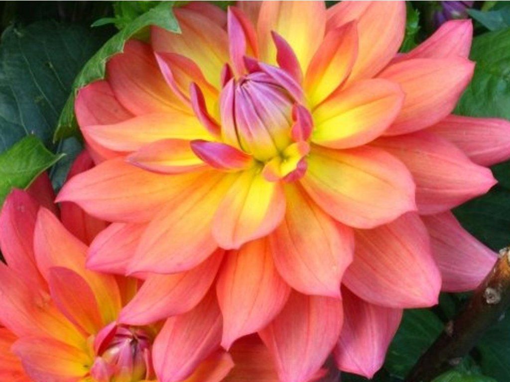 Dalia 'Firepot' - ta dalia ma jedne z najjaśniejszych kwiatów. Kwitnie od połowy lata i trwa aż do października. Kwiaty mają lśniący koralowo-różowy kolor i są otwarte, odsłaniając świeże żółte paski. Kwiaty wznoszą się na mocnych łodygach. Osiąga wysokość około 80 cm.
