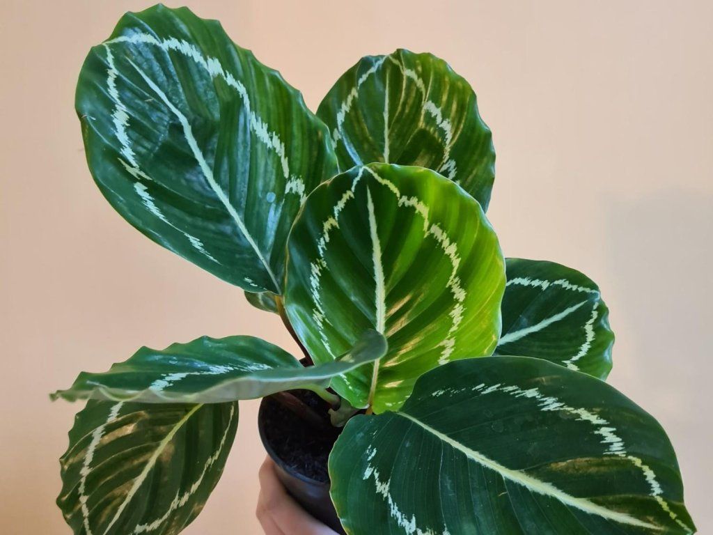 Kalatea 'Apple Bee' - atrakcyjna roślina doniczkowa, która jest u nas mniej znana niż np. jej krewniaczki maranty. Pochodzi z tropikalnych rejonów Ameryki Południowej i Środkowej, a na pierwszy rzut oka zachwyca swoimi nietypowymi, ozdobnymi liśćmi. Mają one ciemnozielony kolor i są zdobione niemal regularnym wzorem. Jest biały i przy odpowiednim oświetleniu może mieć różowy odcień. Krawędzie liści są delikatnie pofałdowane. Należy do tzw. roślin modlących się, które na noc prostują i zamykają liście, a wraz ze wschodzącym słońcem ponownie je otwierają. Różni się od innych roślin modlących się tym, że nowo wyrastające liście wyrastają zwinięte w stożek. W okresie lata może sporadycznie i niepozornie kwitnąć. Jest idealną rośliną do każdego wnętrza.