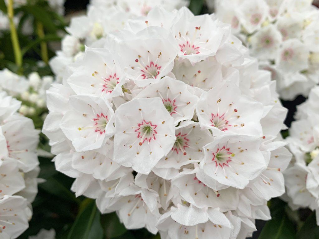 Mamut „Elf” – Nieupadły krzew, pędy rosną pionowo. W wieku dorosłym (w ciągu dziesięciu lat) osiąga wysokość 120 cm i szerokość około 80 cm. Liście są eliptyczne, ciemnozielone, błyszczące, przypominające liście laurowe. Pąki kwiatów są intensywnie różowe. Kwiaty mają kształt kielicha, są 5-6-płatkowe, o lekko zaokrąglonych płatkach. Są pomalowane na biało i mają wewnątrz bordowy pierścień. Kwiat ma około 3,5 cm średnicy. Kwitnie bardzo obficie w czerwcu.