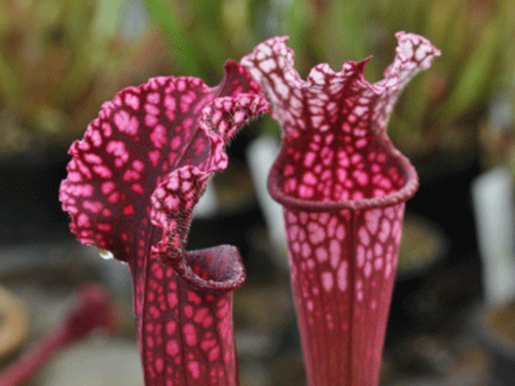 Sarracenia - mięsożerna, naturalnie występująca hybrydowy dzbanecznik, o atrakcyjnym czerwono-różowym kolorze. Roślina pochodzi z Ameryki Północnej, gdzie najczęściej można ją znaleźć na podmokłych, bagiennych terenach. Kwitnie ciekawymi czerwonymi kwiatami od kwietnia do czerwca. Bezpośrednio z systemu korzeniowego wyrastają "rożki", które mają na górze wieczko do przykrywania owadów wpadających do rośliny. W górnej części są żyłkowane.