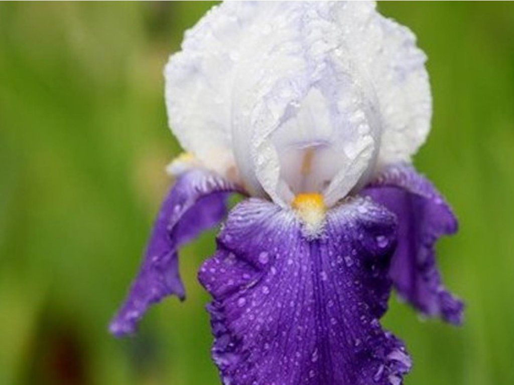Irys niemiecki 'Arpege' - dwukolorowa odmiana, w której wewnętrzne białe, złączone płatki korony towarzyszą fioletowo-niebieskie, opadające kaskadowo. Kwitnie od czerwca do lipca i osiąga wysokość 90cm.