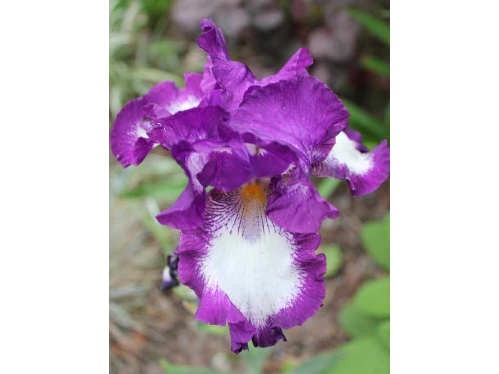Irys niemiecki 'Cozy Calico' - ciemnofioletowy kultywar. Jego płatki mają białe środki i żółte pręciki. Kwitnie od końca maja, a w drugiej turze pod koniec lata. Osiąga 80 cm. Przyjemnie pachnie. Łodyga jest odporna na wiatr i ma wystarczającą wytrzymałość. Tworzy kępy mieczowatych, płaskich liści o szaro-zielonym odcieniu z niebiesko-zieloną poświatą.