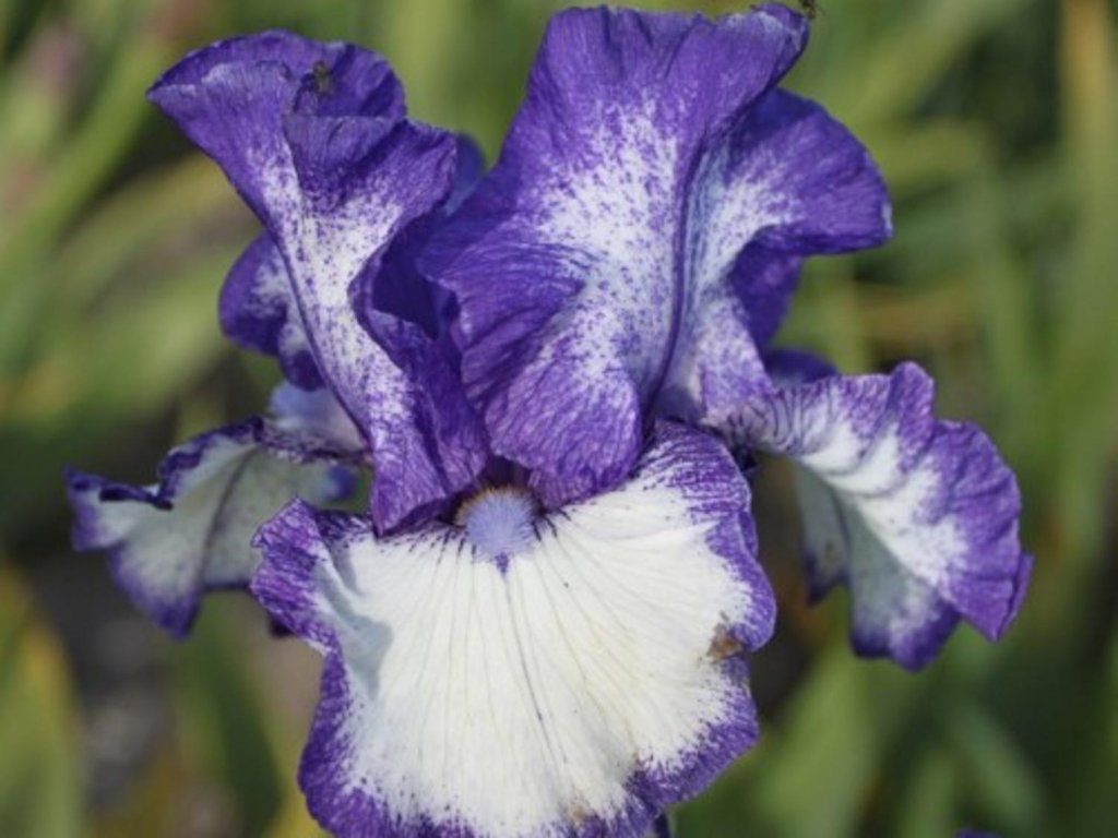 Irys brodaty 'Kissing Circle' - atrakcyjny kultywar o wysokości do 80 cm. Jego kwiaty są w zasadzie białe, zdobione cienką, niebiesko-fioletową obwódką. Kwitnie od końca maja, a w drugiej turze pod koniec lata. Przyjemnie pachnie. Tworzy kępy mieczowatych, płaskich liści o szaro-zielonym odcieniu z niebiesko-zieloną poświatą.