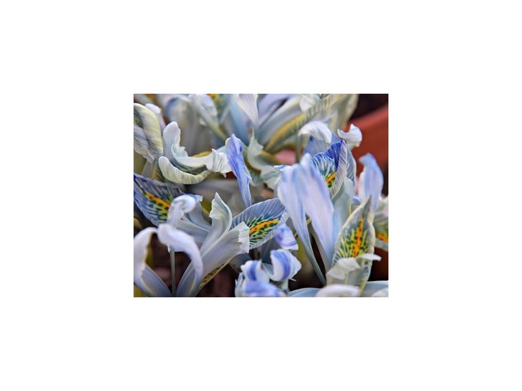 Irysy siatkowane 'Frank Elder' - kolorystycznie wyjątkowy irys, kwitnie już od lutego lub marca. Kwiaty są niebiańsko bladoniebieskie z niebieskimi żyłkami. Języczek wygląda bardzo egzotycznie, jego ubarwienie jest niezwykłe i niebanalne. Promieniste ubarwienie z tygrysim efektem od razu przyciąga wzrok. Bardzo przyjemnie pachnie. Dorasta do wysokości 10-12 cm. Liście są wąskie, jasnozielone z domieszką szarości.