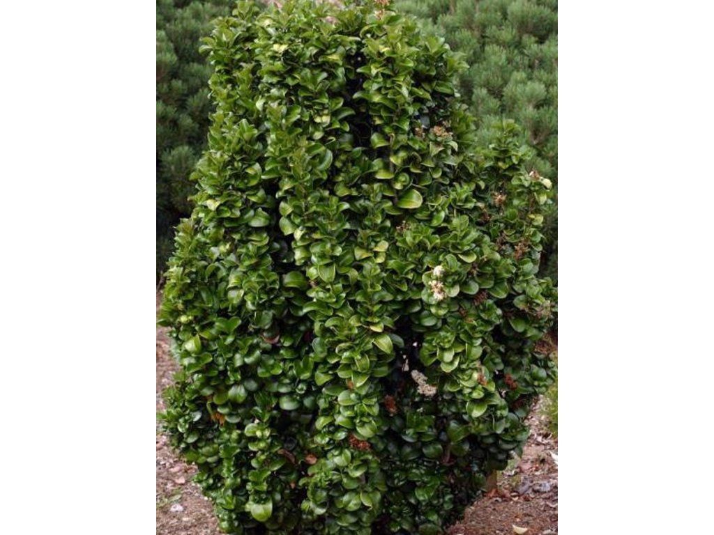 Ligustr japoński 'Rotundifolium' - bardzo atrakcyjny kultywar ligustru, który stanowi atrakcyjny, zimozielony krzew, przyciągający swoimi okrągłymi, ciemnozielonymi liśćmi o błyszczącej powierzchni. Liście te są ciekawie pofałdowane, co dodaje roślinie wizualnego uroku. Są one stosunkowo duże, około 3-6 cm. Swój szczyt osiąga w maju do czerwca, kiedy pojawiają się na nim drobne, pachnące kwiaty. Chociaż kwiaty mogą być stosunkowo niepozorne, przyciągają owady i dodają roślinie kolejny element estetyczny. Ma zwarty, zaokrąglony kształt i może osiągnąć wysokość około 1,5-2 m i szerokość maksymalnie 1 m, co czyni go idealnym wyborem do tworzenia żywopłotów lub do umieszczenia w rabatach ozdobnych.