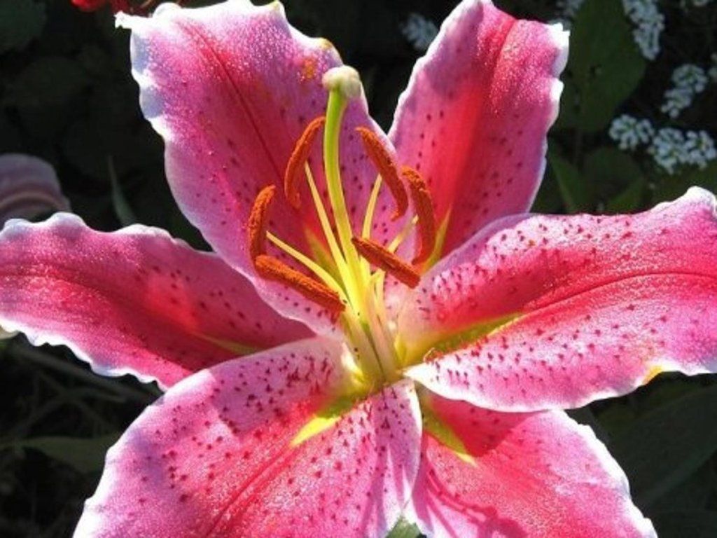 Lilie 'La Mancha' - Wysokiej jakości mieszaniec orientalny. Kwiaty kielichowate mają karminowo-różowy kolor z ciemniejszym nakrapianiem i żółtym środkiem. Faliste brzegi płatków mają białe obrzeżenie. Liście są naprzemianległe, lancetowate. Osiąga wysokość 80-110 cm.