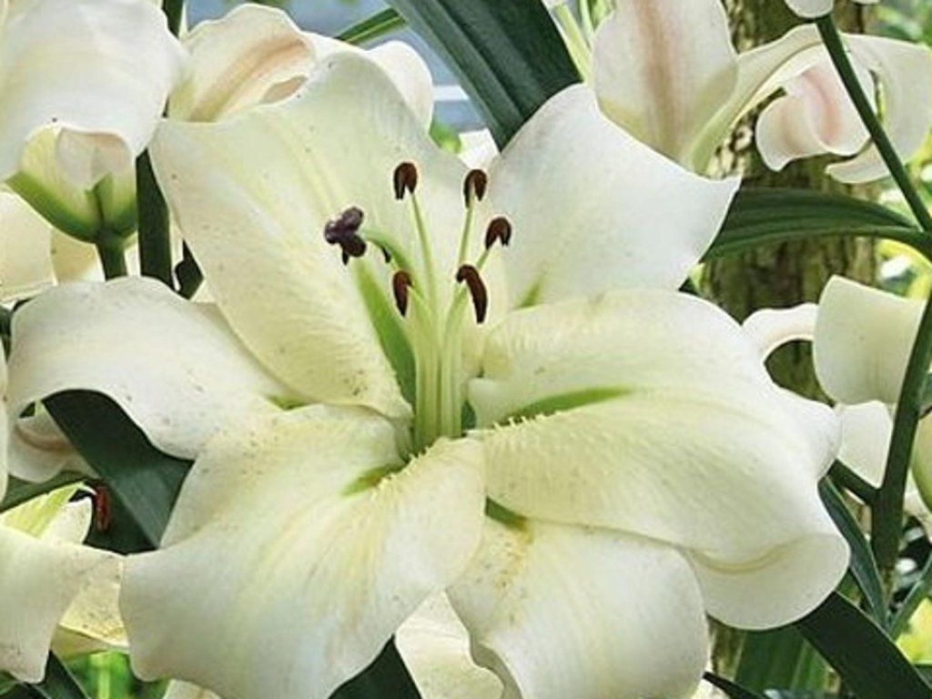 Lilie 'Pretty Woman' - Unikalna lilia, która nikogo nie pozostawi w wątpliwości. Płatki kwiatowe są w kolorze kremowobiałym z lekkim odcieniem jasnoróżowego na brzegach. Końcówki płatków są podwinięte. Kwitnące kwiaty są duże, o średnicy około 20 cm. Osiąga wysokość 150-180 cm.