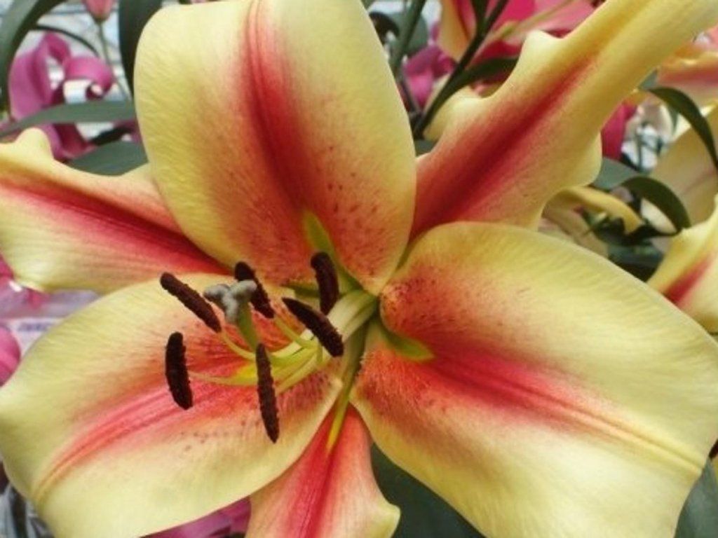 Lilie 'Lavon' - Olbrzymia egzotyczna hybryda lilii orientalnej o bujnym wzroście. Osiąga wysokość do 180 cm. Kwiaty mają średnicę 20 cm i są miseczkowate w kształcie. Płatki kwiatów są w kolorze pastelowożółtym z intensywnie cieniowanym, pomarańczowym środkiem.