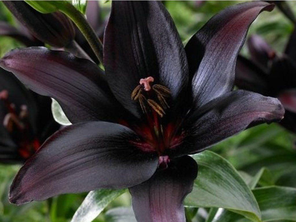 Lilie 'Mascara' - azjatycka lilia hybrydowa. Płatki kwiatowe są spiczaste, woskowe i odporne, wytrzymują zmiany pogody. Dzięki mocnym łodygom wytrzymuje również warunki atmosferyczne. Osiąga wysokość 75 cm. Kwiaty są ciemnowiśniowe, miejscami kolor jest niemal czarny. Kwitną od połowy lata.
