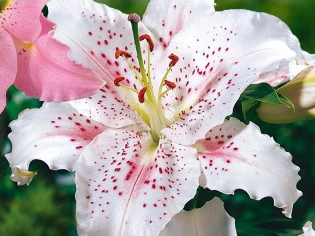 Lilia 'Muscadet' - Trwała, orientalna hybryda lilii. Osiąga wysokość około 60-120 cm. Kwiaty są elegancko pofalowane, kremowobiałe. Płatki zdobią karminoworóżowe kropki i środkowy pasek, pojawiają się od czerwca do sierpnia. Liście są ciemnozielone. Nadaje się do cięcia. Pięknie prezentuje się w każdej donicy, ale także na rabacie bylinowej.