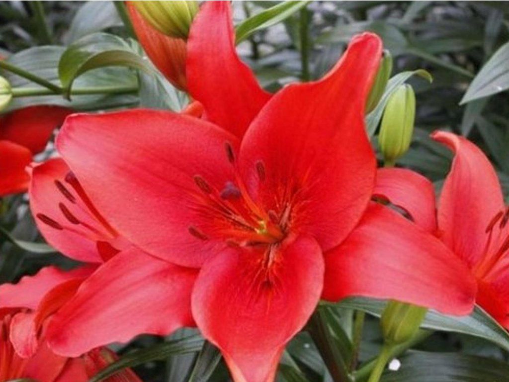 Lilie 'Prunotto' - azjatycka lilia hybrydowa. Płatki kwiatowe są spiczaste i wytrzymałe, odporne na zmiany pogody. Mają aksamitnoczerwony kolor, bardzo wyrazisty. Osiąga wysokość 90 cm. Prawdziwy klejnot wśród lilii. Kwitną od połowy lata.