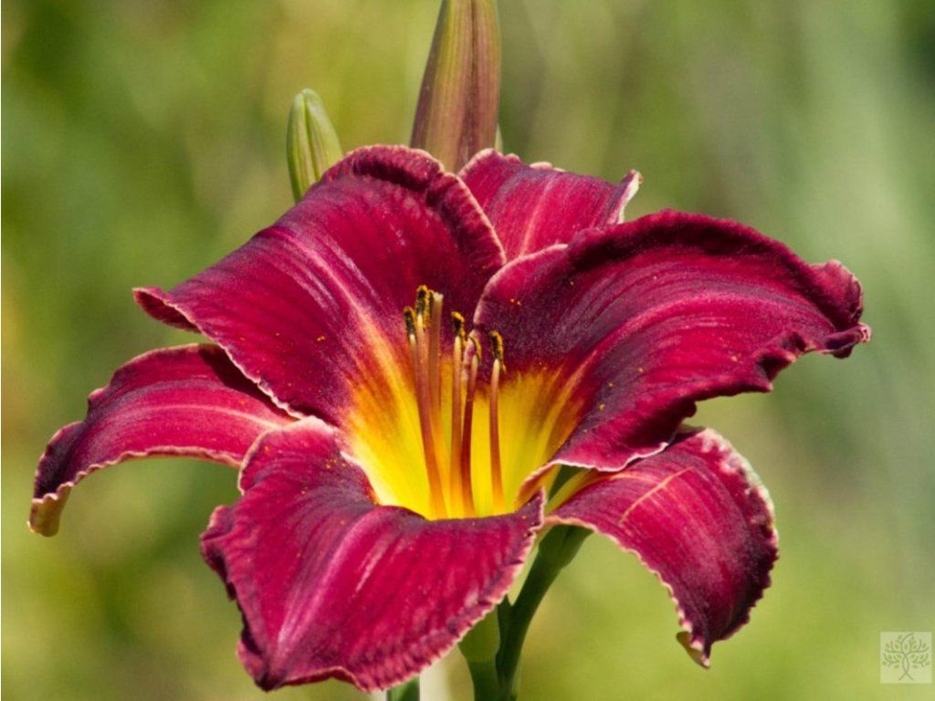 Liliowiec 'Mieszko I' - imponujący kultywar, z dużymi, intensywnie bordowymi kwiatami, z jaskrawożółtym środkiem. Brzegi płatków są lekko pofalowane. Bylina kępiasta osiąga wysokość 90 cm. Kwiaty pojawiają się w lipcu i sierpniu.