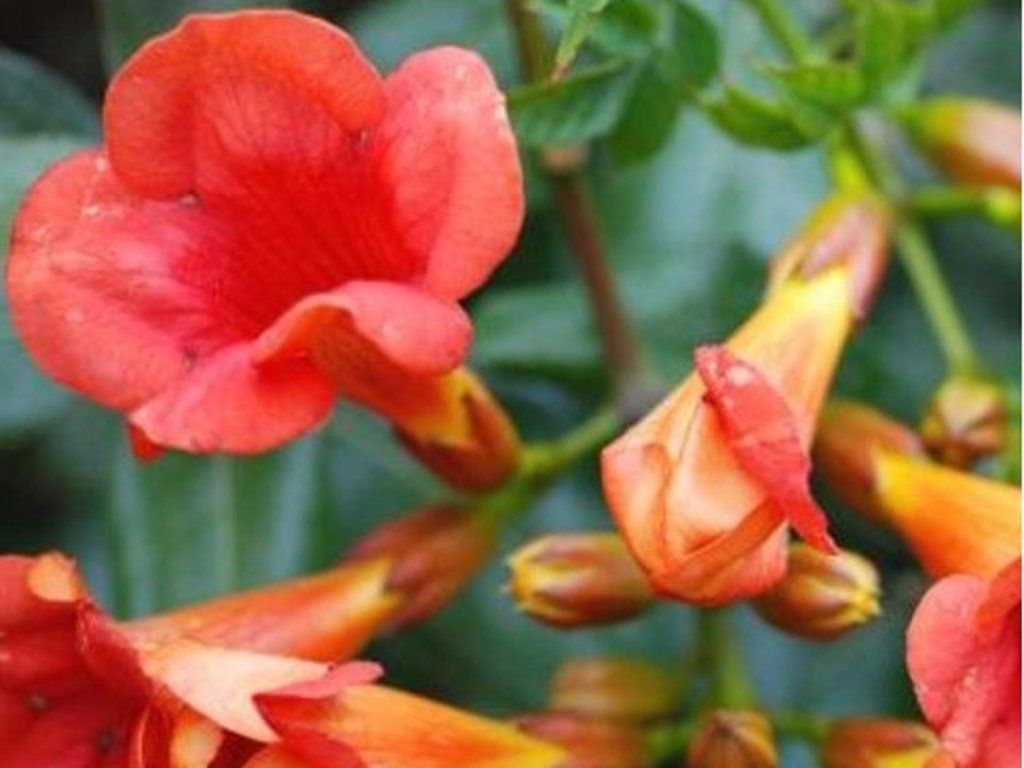 Milin pnący 'Madame Galen' - kwiaty są duże, szerokie na 7-9 cm. Kolor jest pomarańczowo-czerwony i mają pomarańczowo-żółte gardziele. Pąki tworzą grono, które stale kwitnie aż do mrozów. Dorasta do wysokości 3 - 6 m. Liście są duże, ciemnozielone, nieparzystopierzaste. Pędy potrafią być bardzo długie i jeśli chcesz utrzymać tę roślinę pnącą w mniejszym rozmiarze, przycinaj ją wiosną po mrozach, w żadnym wypadku w sezonie, ponieważ kwitnie na końcach młodych pędów, przez co pozbawiłbyś się pąków.