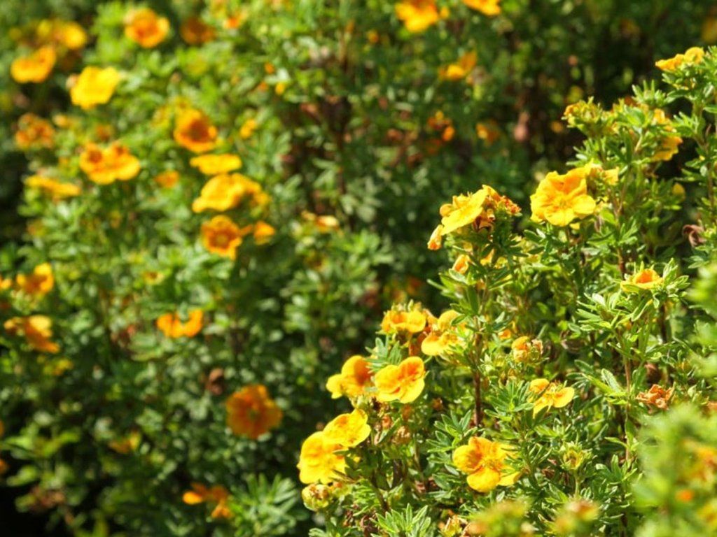 Pięciornik krzewiasty 'Mango Tango' - gęsto rozgałęziony, niski i zwarty krzew, osiągający wysokość około 60 cm. Od maja do października obsypany jest złotożółtymi kwiatami z pomarańczowym środkiem, które nadają ogrodowi wyrazisty i słoneczny wygląd. Drobne liście mają świeży zielony kolor, który w ciągu lata na bezpośrednim słońcu może lekko przebarwiać się na żółto, nadając krzewowi ciekawy i zmienny efekt. Roślina jest odporna na zanieczyszczone środowisko i łatwa w uprawie, co czyni ją odpowiednią do różnych typów ogrodów. Doskonale nadaje się do ogrodów skalnych, na obrzeża rabat, a także do zakrywania mniej atrakcyjnych powierzchni, gdzie swoim zwartym pokrojem i długim kwitnieniem przyciąga uwagę.