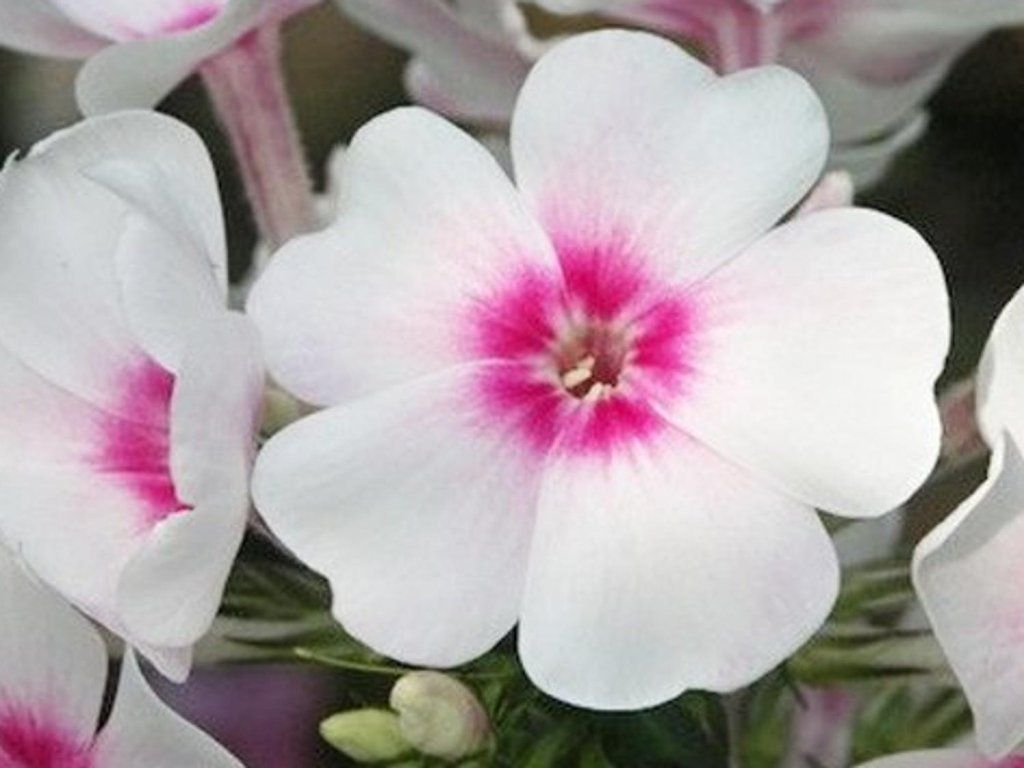Floks wiechowaty 'Kirmeslander' - odmiana o białych kwiatach i wyraźnie różowym środku, o średnicy do 2,5 cm. Osiąga wysokość do 1,2 m i szerokość 70 cm. Kwitnie od lipca do września. Sadzić w pełnym słońcu lub w półcieniu.
