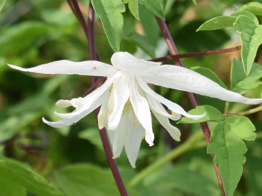 Clematis 'Albina Plena' - ozdobna odmiana powojnika alpejskiego, zaliczana do grupy powojników wcześnie kwitnących atragene. Powstał w wyniku hodowli w warunkach skandynawskich i posiada cechy gatunków pochodzących z górskich obszarów Europy i Azji. Tworzy opadający, delikatnie rozgałęziony pnącz, który za pomocą ogonków liściowych przyczepia się do podpory i w ogrodach zazwyczaj osiąga 3–4 m wysokości i około 1,5 m szerokości. Pędy są cienkie, elastyczne i z wiekiem drewnieją. Liście są nieparzystopierzaste do głęboko podzielonych, z mniejszymi listkami, w kolorze świeżej do średniozielonej. Główną ozdobą są pełne kwiaty w kształcie lekko pochylonego dzwonka, o średnicy około 6–8 cm. Składają się z kilku rzędów wąskich, lancetowatych płatków w kolorze kremowobiałym do czystobiałego, z zaznaczeniem żółtego środka. Główne kwitnienie odbywa się w kwietniu i maju na zeszłorocznym drewnie, w sprzyjających latach latem mogą pojawić się pojedyncze dodatkowe kwiaty. Po przekwitnięciu powstają charakterystyczne, puchate nasiona, które nadają pnączowi ozdobny wygląd aż do jesieni. 'Albina Plena' nadaje się do pnącia po pergolach, murkach, starych krzewach lub mniejszych drzewach i wyróżnia się naturalnym, lekko leśnym charakterem. Nie jest wymagający w uprawie i jest bardzo odporny. Powojnik jest ogólnie pięknym elementem do ogrodów, dodaje delikatnego i przyjemnego wyglądu każdemu ogrodowi. Należy do grupy 1 powojów określającej ich cięcie.