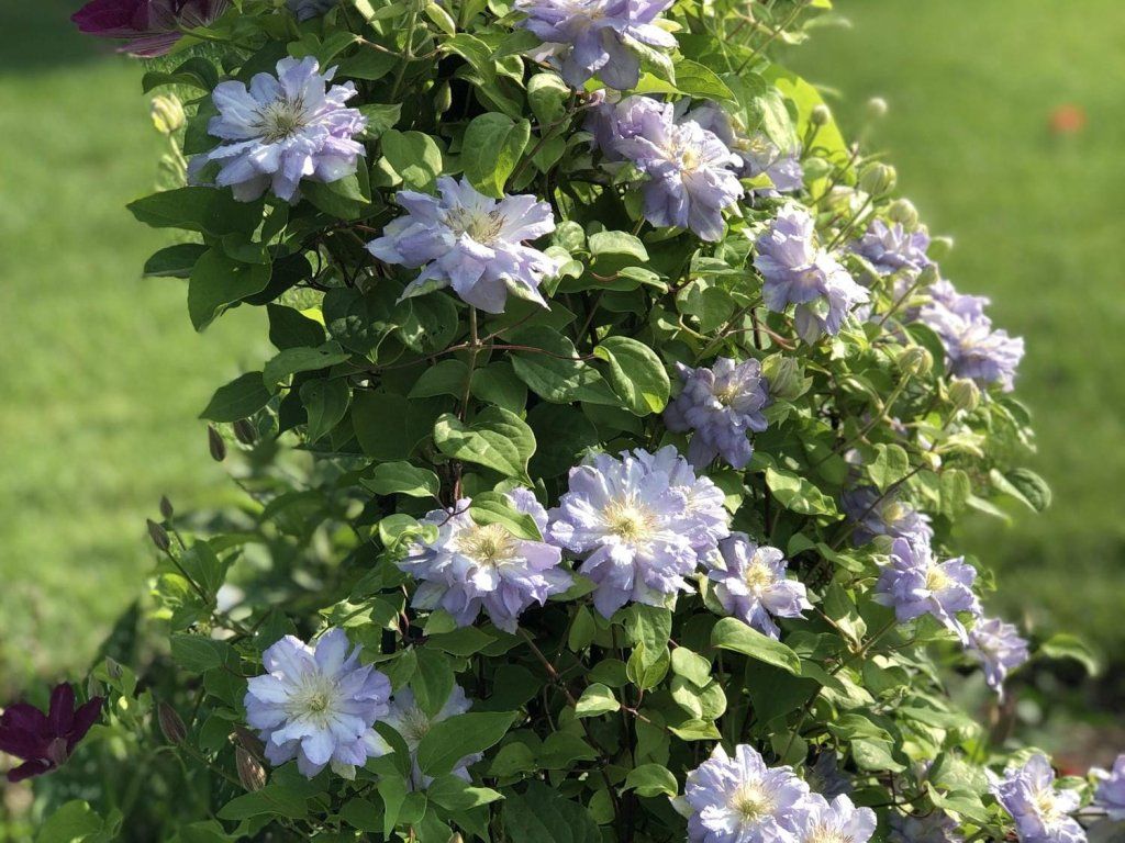 Powojnik 'Diamond Ball' - kompaktowa odmiana wielkokwiatowa z nowoczesnej serii hodowlanej Raymonda Evisona, skupiającej się na obfitym kwitnieniu i mniejszym wzroście, która dobrze sprawdzi się również w pojemnikach. Pędy zazwyczaj dorastają do 1,5–2 m, szerokość rośliny wynosi około 0,6–1 m. Liście są naprzeciwległe, intensywnie zielone, latem tworzą gęsty płaszcz nadający się do pnącia po niewielkiej kratce, trejażu lub balustradzie balkonowej. Największą ozdobą są pełne, wielorzędowe kwiaty o średnicy około 10–12 cm, które kształtem przypominają okrągłe pompony. Płatki mają delikatny niebieski do niebiesko-fioletowego odcień z lekkim rozjaśnieniem przy brzegach, środek kwiatu tworzą krótkie, gęsto złożone płatki wewnętrzne (petaloidy). Kwitnienie zazwyczaj trwa od czerwca do sierpnia, w sprzyjających warunkach przedłuża się do września, zarówno na pędach zeszłorocznych, jak i na nowym drewnie. Ta odmiana sprawdzi się jako subtelny akcent w przedogródku, na tarasie lub balkonie, dodając nasadzeniom lekko romantycznego charakteru bez nadmiernych wymagań przestrzennych. Nie jest wymagający w uprawie i jest bardzo odporny, dzięki czemu powojnik jest odpowiednią rośliną zarówno dla początkujących, jak i dla doświadczonych ogrodników. Należy do 2. grupy powojów, określającej ich cięcie.