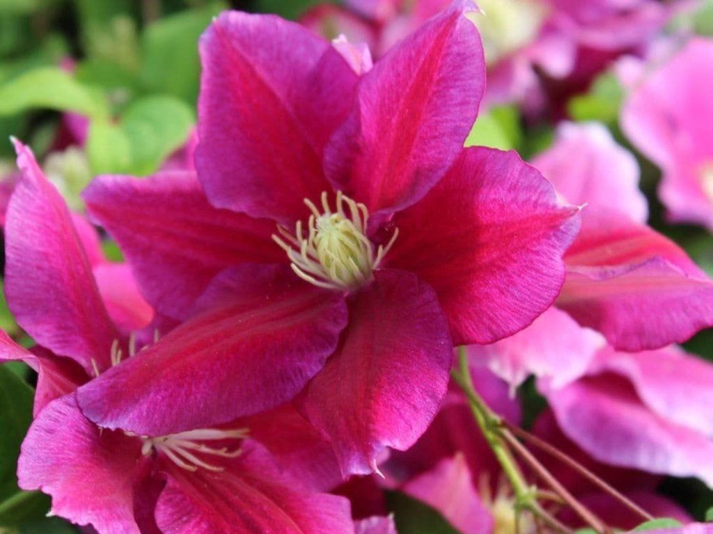 Clematis 'Hania' - powojnik wielkokwiatowy z rodziny jaskrowatych pochodzący z polskiej hodowli Szczepana Marczyńskiego. W warunkach środkowej Europy tworzy opadające, cieńsze, ale mocne pędy dorastające do wysokości około 2–2,5 m i szerokości około 1–1,5 m w zależności od jakości stanowiska i zastosowanego podparcia. Pędy przyczepiają się do podpory ogonkami liściowymi, dzięki czemu łatwo porastają siatkowe płoty, pergole i lżejsze trejaże przy tarasach. Liście są jajowate, podczas kiełkowania często z odcieniem zielonkawym do lekko purpurowego, później średnio do intensywnie zielonych, a jesienią opadają. Najbardziej wyrazistym elementem odmiany są duże kwiaty o średnicy 12–16 cm, które pojawiają się w dwóch falach. Pierwsze kwitnienie odbywa się od końca maja do czerwca na pędach zimujących, drugie w sierpniu i wrześniu na nowych przyrostach. Działki kielicha są aksamitnie purpurowo-czerwone z wyraźnie jaśniejszym różowym do różowo-fioletowego brzegu, środek kwiatu tworzą złotożółte pręciki. Ta dwubarwność ułatwia łączenie z różami, hortensjami i trawami ozdobnymi w cieplejszych tonacjach, a odmiana dobrze komponuje się z romantycznymi i wyrazistymi kolorystycznie zestawieniami. Jeśli więc szukasz niewymagającej rośliny, która rozświetli Twój ogród wspaniałym kolorem, który przyciągnie uwagę na pierwszy rzut oka, to ten kultywar jest właściwym wyborem. Należy do 2. grupy powojników określającej ich cięcie.