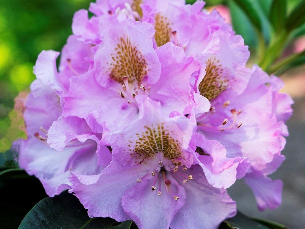 Rododendron 'Polonez Chopina' - kolejny świetny kultywar z warsztatu hodowców z Průhonic. Tworzy wyprostowany, zwarty krzew, który osiąga wysokość 160 cm i szerokość 140 cm. W maju obficie kwitnie. Kwiaty są zebrane w kuliste skupiska na szczytach pędów. Są typowo szeroko otwarte, jasno fioletowe z wyraźnym, musztardowym rysunkiem. Liście są podłużne, ciemnozielone i błyszczące. Z kwiatami tworzy ciekawy kontrast. Ten kultywar niezawodnie sprawdzi się jako soliterowy krzew, ale świetnie będzie wyglądał również jako element kompozycji grupowej.