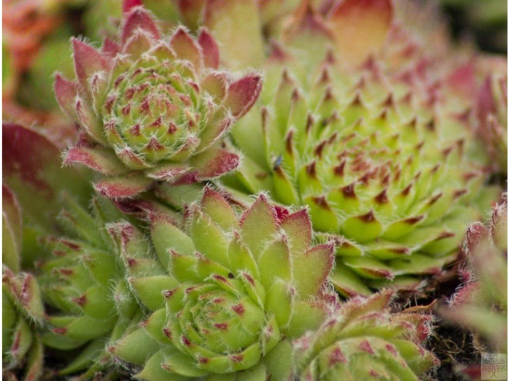 Sempervivum x hybridum (rozchodnik) – duża grupa roślin skalnych, zazwyczaj niskiego wzrostu, wielkość rozet około 10 cm. Doskonały do sadzenia na kamiennych murkach, skalniakach, do obsadzania dachów domów itp. Sadzi się go na glebach suchszych, niezbyt bogatych w składniki odżywcze, z dobrym drenażem. Uwielbia pełne słońce, zniesie nawet bezpośrednie palące słońce. Półcień mu również nie przeszkadza, jednak już wpływa na pełnię zabarwienia. Mrozoodporny. Kwiaty w lipcu i sierpniu.