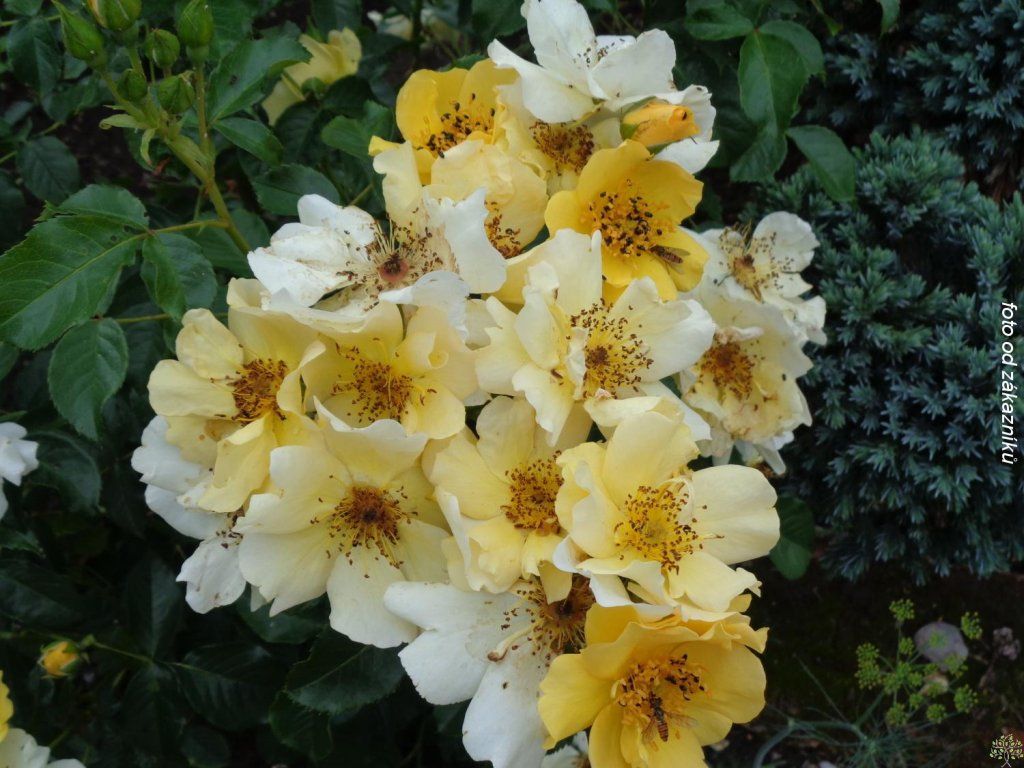 Róża 'Coloma®' - odmiana floribunda, która powstała w Belgii u hodowcy Martina Vissersa około 2008 roku i została nazwana na 20. rocznicę powstania znanego ogrodu różanego Coloma w Sint-Pieters-Leeuw. Krzew rośnie zwarcie, lekko rozłożystie, osiągając wysokość około 60-70 cm i szerokość 40-50 cm. Pędy posiadają średnią ilość kolców i są gęsto pokryte ciemnozielonymi, błyszczącymi liśćmi, które podkreślają kolor kwiatów. Kolor ten zmienia się w trakcie kwitnienia - z jasno pomarańczowych pąków rozwijają się jasnożółte do żółto-pomarańczowych, półpełne, miseczkowate kwiaty o średnicy około 6-8 cm, które pod koniec kwitnienia nabierają słomkowożółtego, a ostatecznie kremowo-białego odcienia. Środek kwiatu pozostaje częściowo otwarty, z wiązką złotych pręcików, co zwiększa jego atrakcyjność dla owadów zapylających. Pojawiają się w skupiskach po 5-10 sztuk na końcach pędów od czerwca do października, często nieprzerwanie aż do pierwszych mrozów. Zapach jest delikatny do średnio intensywnego, słodko-kwiatowy. W kompozycji sprawdzi się w przedniej i środkowej części rabat mieszanych, w większych grupach jako niski pas kwitnący, w pojemnikach na tarasie, a także jako towarzystwo dla wyższych róż czy traw ozdobnych. Kolorystycznie dobrze komponuje się z bylinami kwitnącymi na niebiesko i fioletowo, na przykład z szałwią, lawendą, bodziszkami lub jeżówkami, a kwiaty nadają się również do cięcia do mniejszych wazonów.
