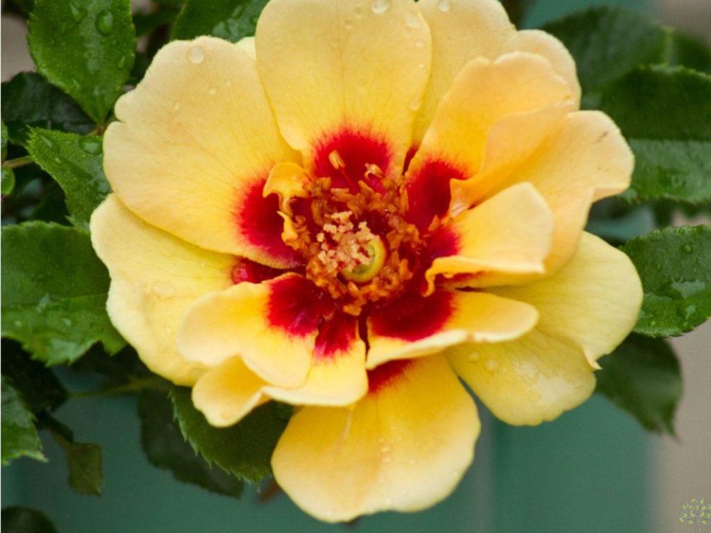 Róża ´Maja Babylon Eyes®´ - kompaktowa, wielokwiatowa róża, która powoli rośnie do wysokości i szerokości około 50 cm. Posiada charakterystyczne, ciemnożółte kwiaty przypominające hibiskus, z czerwonym środkiem.