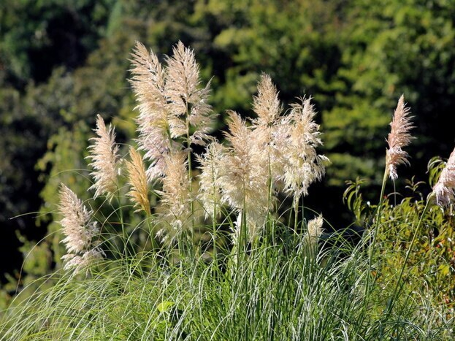 - Majestatyczne solitery: Trawa pampasowa (Cortaderia) z wielkimi pióropuszami oraz Miskant chiński (Miscanthus) o setkach barwnych odmian.