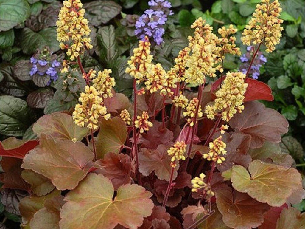 Żurawka 'Little Cutie Blondie' - Wiecznie zielona bylina, osiągająca wysokość 20 cm. Żółte kwiaty pojawiają się od czerwca do sierpnia. Liście są sercowate z ząbkowanymi brzegami. Duże liście mają karmelowo-brązowo-pomarańczowe zabarwienie w kilku odcieniach. Kolor liści zależy od stanowiska. Nadaje się do sadzenia w grupach lub jako obrzeże ścieżek.