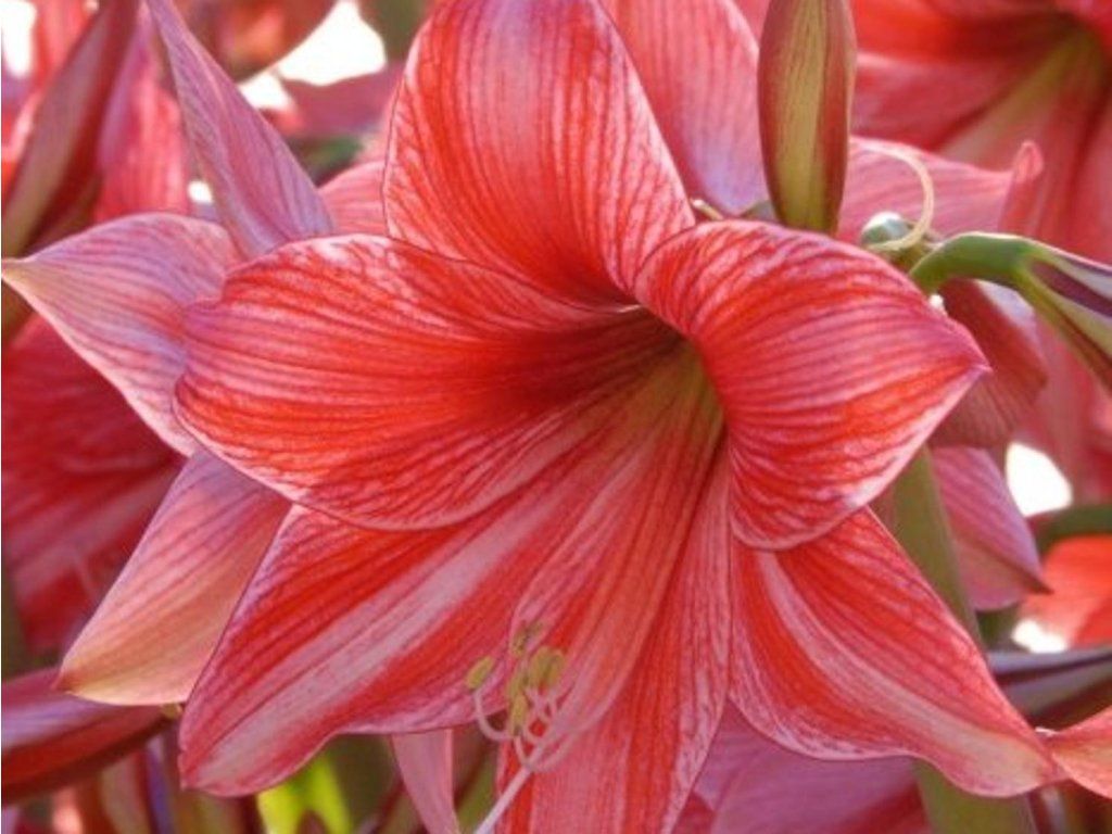 Amarylis 'Pyjama Party' - do 6 kwiatów na jednej łodydze może zakwitnąć u pięknej odmiany Pyjama Party. Kwiaty są jednolicie różowe, ale wyróżnia je czerwone unerwienie wychodzące z gardzieli kwiatu. Osiąga wysokość 100-120 cm.